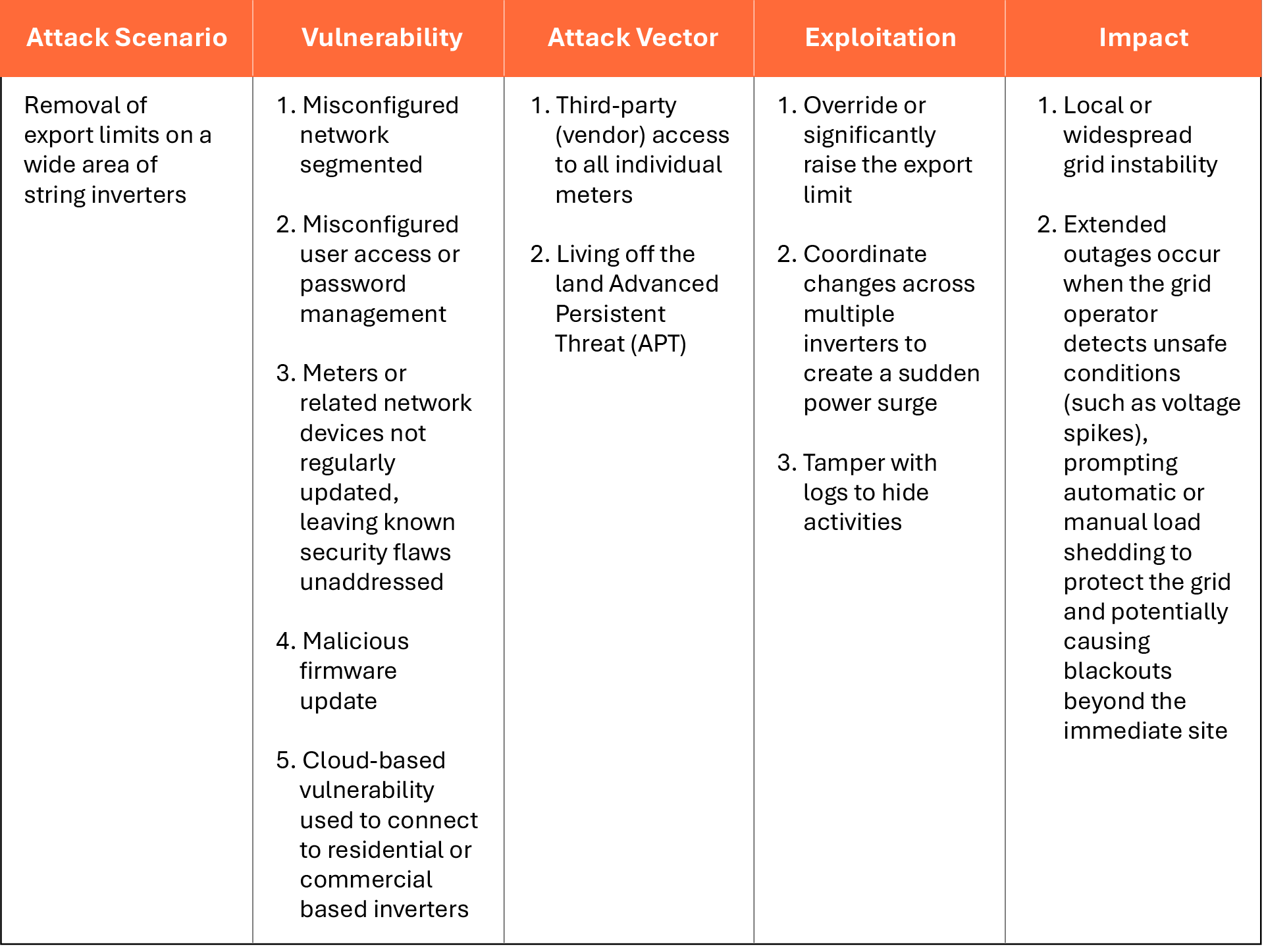 Commercial and residential inverters represent a critical intersection of high likelihood and high impact. These systems often operate with weaker security controls, creating a broad and vulnerable attack surface. The risk is amplified by the growing aggregate generation capacity of distributed solar resources, which now supply a substantial share of daytime demand in many regions. This makes them both more attractive targets and more capable of leading to large-scale disruption. Potential threats include unauthorized configuration changes, remote shutdowns and tampering with safety mechanisms, any of which could result in localized or neighborhood-scale outages. More severe risks arise if attackers disable anti-islanding protections or override export limits, as the resulting grid imbalances could escalate into transmission-level instability, undermining overall grid reliability. Figure 5 illustrates how vulnerabilities in string inverters can be exploited to trigger these types of outcomes.