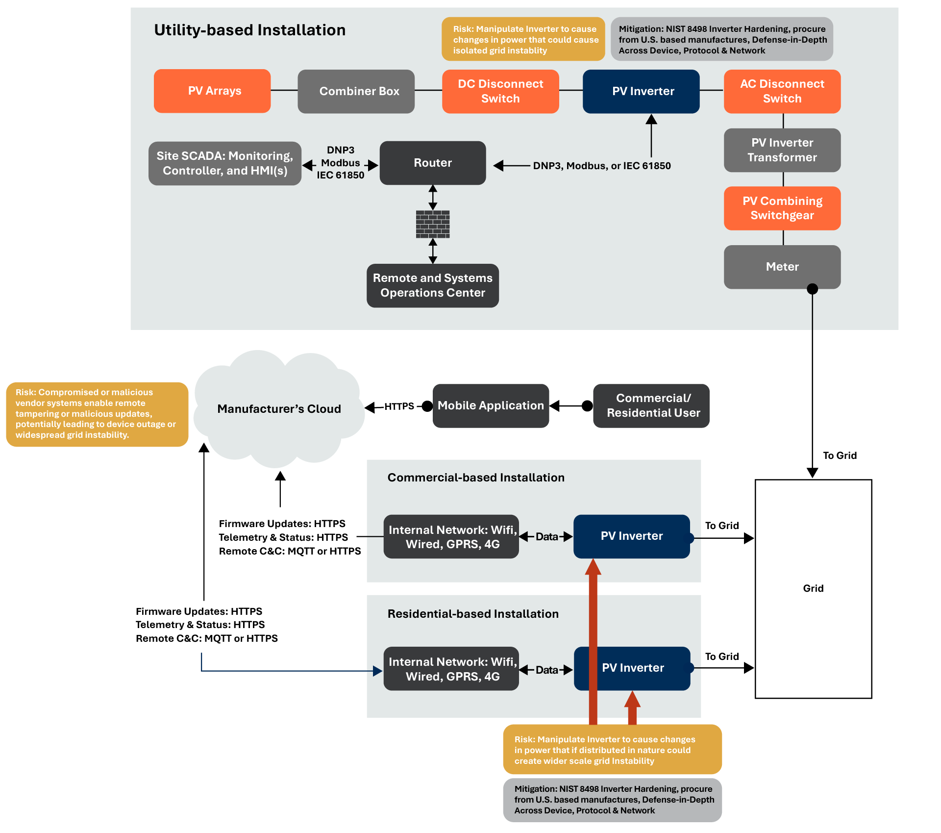 A significant share of residential and commercial string inverters are equipped with wireless connectivity to cloud platforms, many of which are operated by Chinese companies. Six of the world’s top 10 solar power system vendors, including inverter manufacturers, are headquartered in China. As a result, more than half of all inverters are both owned and manufactured in China, while another 30% are produced in Chinese facilities on behalf of U.S. or other international companies. This concentrated supply chain raises serious cybersecurity concerns. Risks include remote firmware updates routed through foreign-controlled infrastructure, as well as persistent internet connectivity that enlarges the attack surface and the possibility of hardware-level compromises such as embedded rogue communication devices. Equally concerning is the potential for deliberate actions by the manufacturer, or for the exploitation of vulnerabilities, that push malicious firmware at scale and jeopardize the security and reliability of deployed systems.